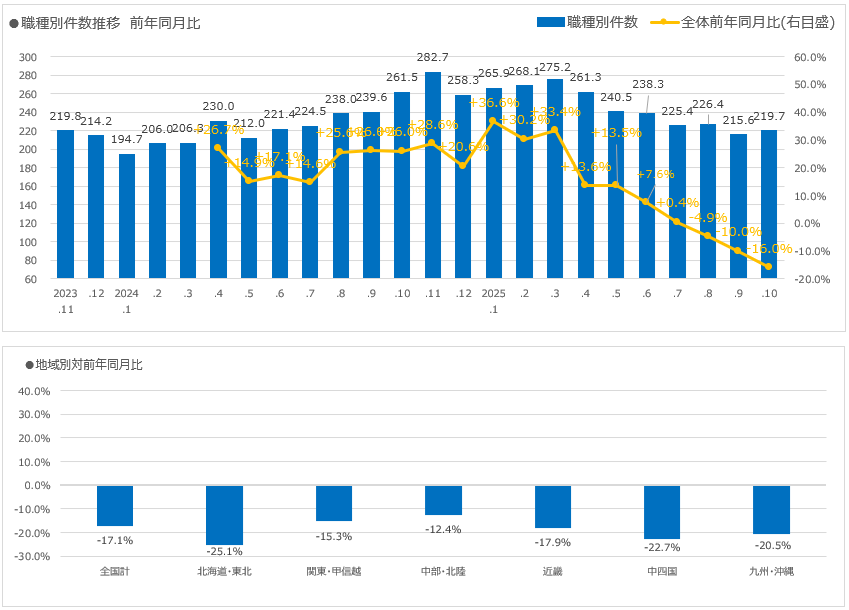 2025年10月の求人広告市場は、短期的には微増、長期的には大幅減少という複雑な局面にあります。
